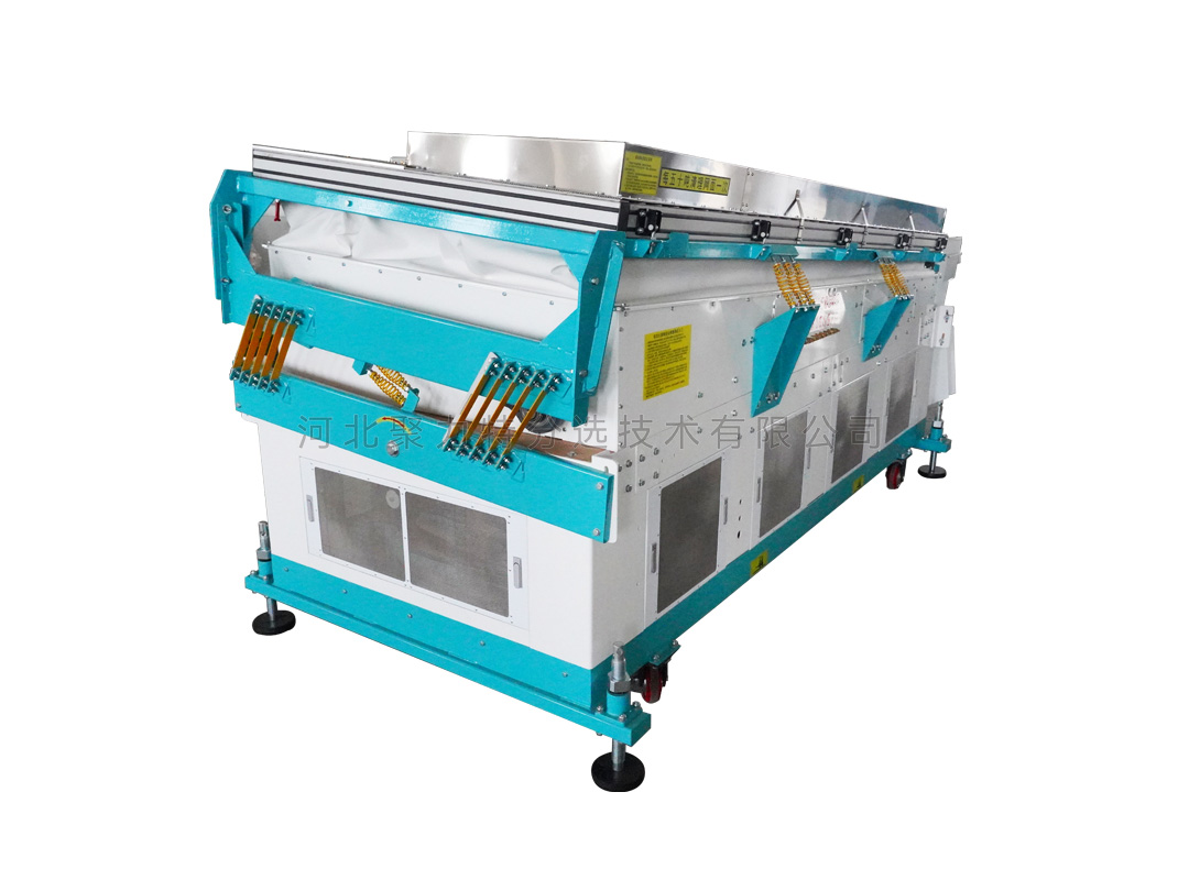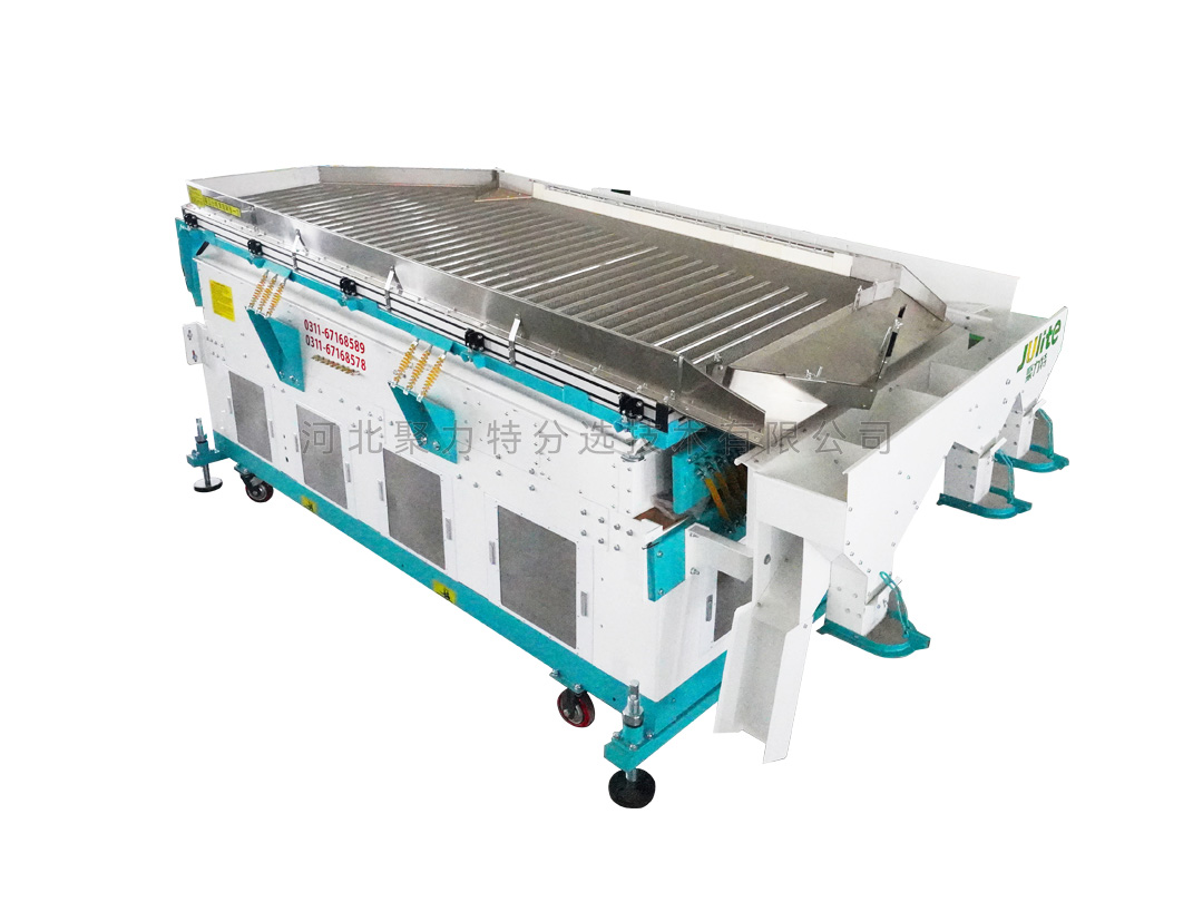吹式比重精選機(jī)是根據(jù)物料在空氣動力和振動摩擦力的雙重作用下產(chǎn)生比重偏析的原理,通過調(diào)整風(fēng)壓、振幅等技術(shù)參數(shù),使比重較大的物料沉到底部貼著篩面由低向高運(yùn)動;比重較小的物料懸浮在表面由高向低運(yùn)動,從而達(dá)到比重分離的目的。有效去除物料中的秕籽、芽籽、蟲蛀粒、霉變粒、黑粉病粒等比重較輕的雜質(zhì);側(cè)面增加成品側(cè)出糧功能,增大產(chǎn)量;同時比重精選機(jī)振動臺面上部設(shè)有一個去石傾角,能將物料中的石子分離出來。